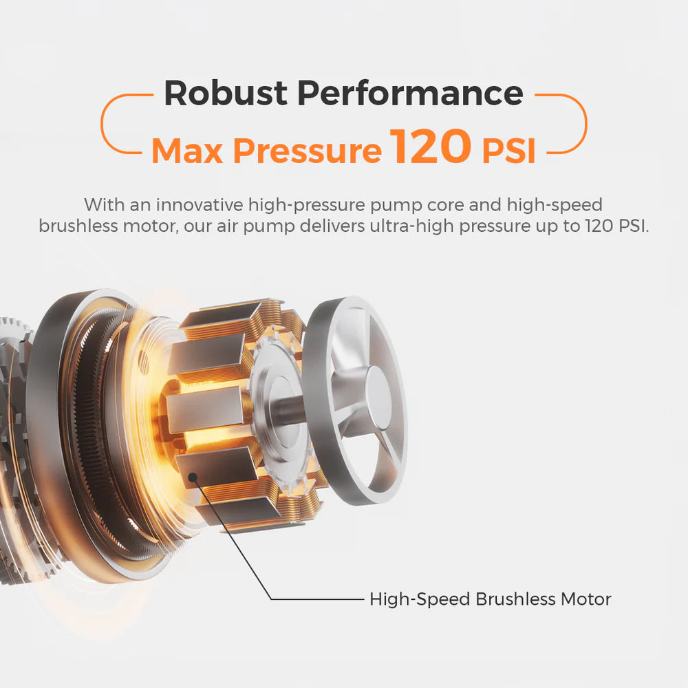 Wyposażona w precyzyjny silnik bezszczotkowy i tłok o krótkim skoku i dużej średnicy, pompka osiąga ciśnienie do 130 PSI. Dzięki zmniejszonemu tarciu jest bardziej wydajna i niezawodna, a ryzyko awarii zostało zredukowane do minimum.