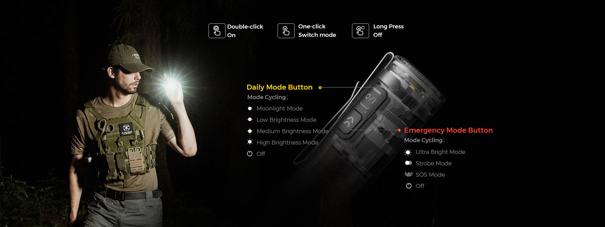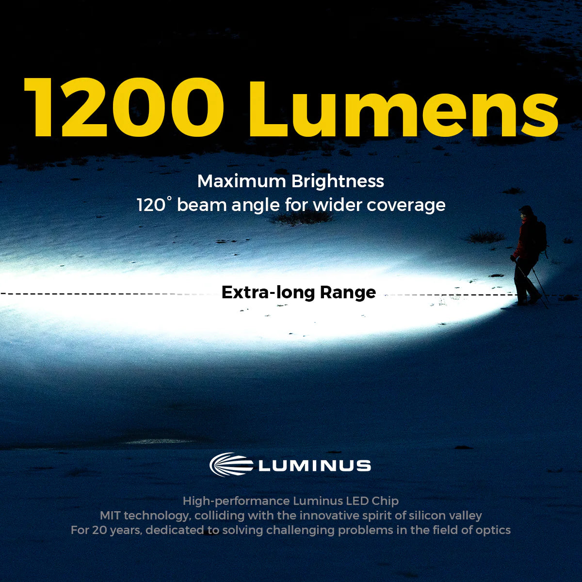 Wykonana z wytrzymałego aluminium, łączy trwałość z funkcjonalnością, oferując pięć poziomów jasności (1–1200 lm) oraz tryby SOS i stroboskopowy.
